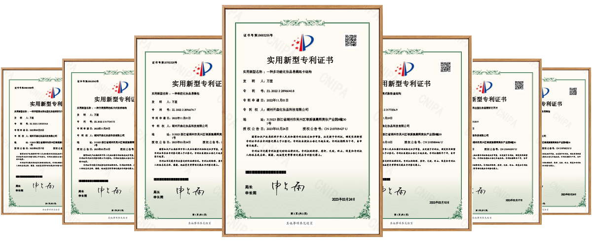 經(jīng)過(guò)多年的研發(fā)創(chuàng)新,湖州開(kāi)森現(xiàn)擁有【一種便攜式散粉盒結(jié)構(gòu)】、【一種多功能化妝品易揭紙卡結(jié)構(gòu)】、【一種方便攜帶的紙卡式粉餅結(jié)構(gòu)】、【一種雙腔混合擠出型化妝品易撕包】、【一種雙腔掰折擠出型化妝品掰折打開(kāi)片】、【一種單腔掰折擠出型化妝品掰折打開(kāi)片證書(shū)】等多種專利,可以根據(jù)客戶的不同需求,進(jìn)行深度創(chuàng)新,滿足市場(chǎng)和產(chǎn)品日益更新的需求。